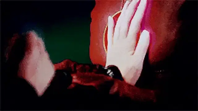 Zoey Clarke and Simon Haynes share an intense moment, looking deeply into each other's eyes in this scene.