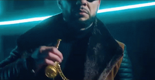 Rapper Mc Doni showcases his impressive gold chain and medallion, wearing sunglasses in a neon-lit setting.