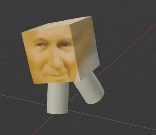 A 3D animated cube with Pope John Paul II's face, known as 'żółta Morda', walking.