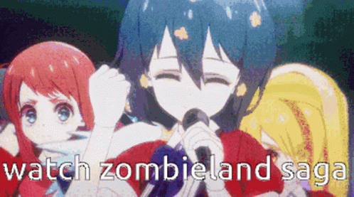Franchouchou members from Zombieland Saga, including Ai Mizuno and Sakura Minamoto, perform on stage.
