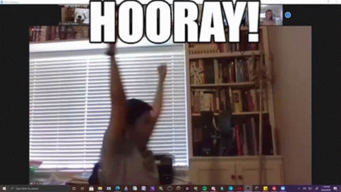 A person raises their arms in excitement during a Zoom meeting, with 'HOORAY!' text displayed.