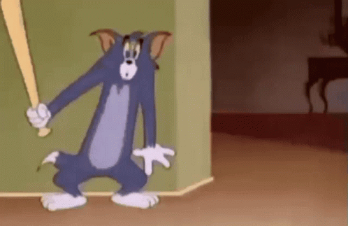 Tom (from Tom and Jerry) holds a bat, reacting with fear as a floating head, possibly Zoontr Rakhi, flies past him.