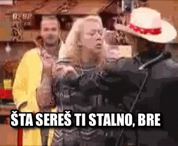 Zorica Markovic in a heated argument with a man in a cowboy hat, exclaiming 'Šta sereš ti stalno, bre'.