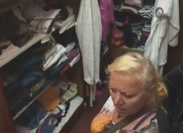 Zorica Markovic appears distressed while sitting in a cluttered closet, surrounded by clothes on shelves.