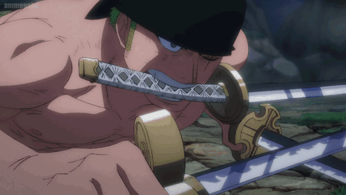 Zoro faces off against King in an intense battle, preparing his swords for combat.