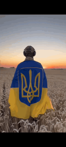 Ukrainian soldier stands in a wheat field at sunset, draped in the Ukrainian flag with the Tryzub emblem.