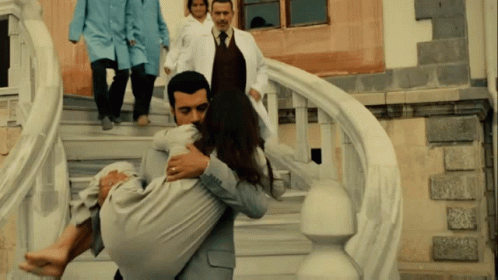 Murat Ünalmış carries Hilal Altınbilek (Züldem) down stairs in a dramatic scene from Bir Zamanlar Çukurova.