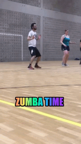 Renaud Rhetokot leads a lively Zumba session with a group on a gym floor, enjoying the dance workout.