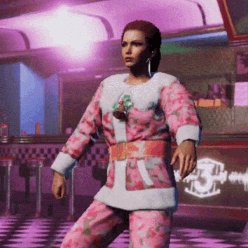 A woman performs the Zumi Zümi dance in a pink Santa-like outfit within a game setting.