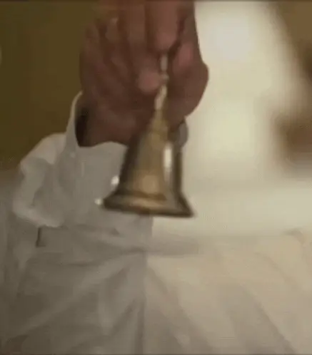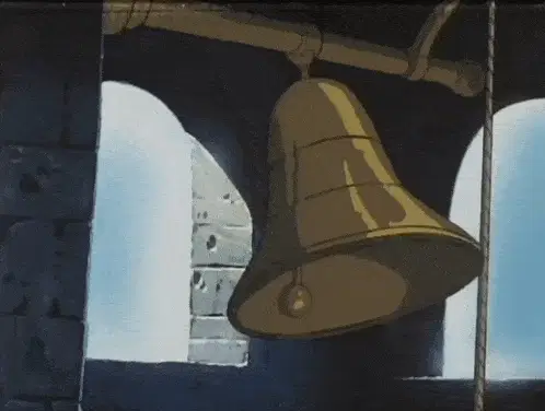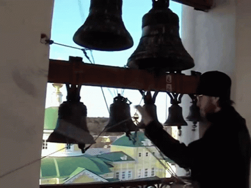 Monk ringing church bells in a bell tower with a view of green-domed buildings.