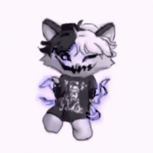 An animated Zxc cat character with sharp teeth and two-tone fur dances, shifting between monochrome and purple hues.