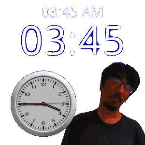 a man is standing in front of a clock that says 03:45 am