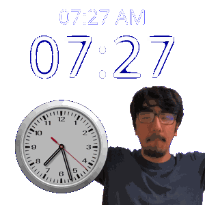 a man is holding a clock in front of a sign that says 07/27 am