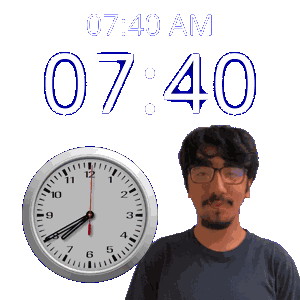 a man with glasses stands in front of a clock that reads 7:40