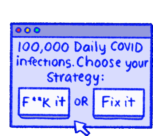 Animated pop-up window showing a choice between 'F**k it' or 'Fix it' in response to 100,000 daily COVID infections.