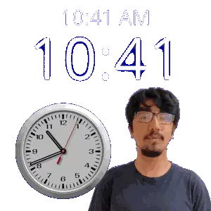 a man with glasses stands next to a clock that reads 10:52 am