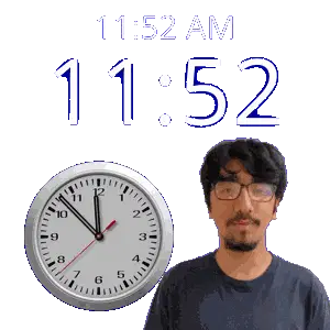 a man wearing glasses stands in front of a clock that says 11:24 am