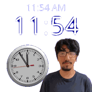 a man wearing glasses stands in front of a clock that says 11:54 am