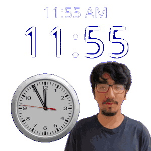 a man with glasses stands next to a clock that says 11:55
