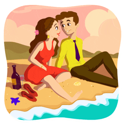 A romantic couple enjoys a picnic on the beach, sharing wine and looking lovingly at each other.