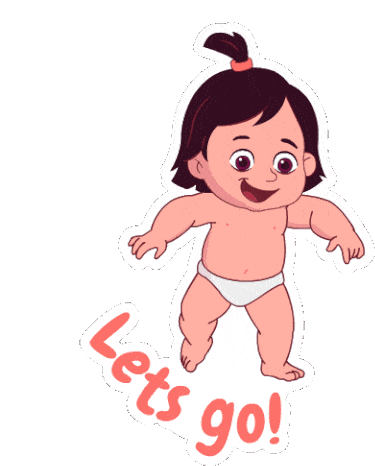 A cute animated baby with a ponytail, wearing a diaper, happily walks forward with the text 'Lets go!' encouraging action.