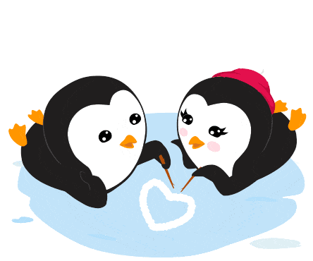 Two adorable cartoon penguins lie on ice, drawing a heart shape together with sticks, symbolizing love and affection.