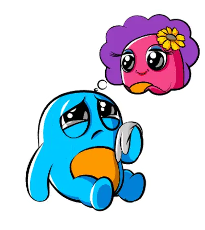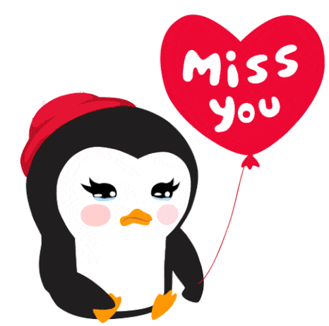 A cute, sad penguin in a red hat sits with tears, holding a red heart balloon that says 'Miss You,' expressing longing.