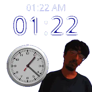 a man with glasses stands next to a clock that says 12:22 pm
