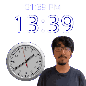 a man wearing glasses stands next to a clock that says 12:39