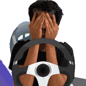 a man with glasses is covering his face with his hands while holding a steering wheel