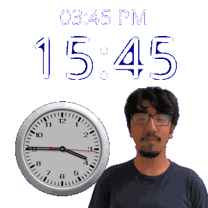 a man with glasses stands in front of a clock that reads 15:45