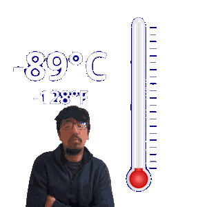 a man with glasses stands next to a thermometer that reads -89 degrees c