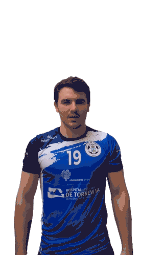 David Guillen, wearing his Mare Nostrum Torrevieja handball jersey with number 19, makes a gesture.
