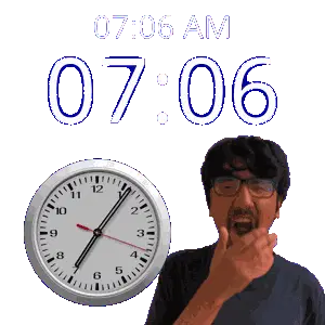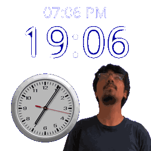a man stands in front of a wall clock that says 19:06