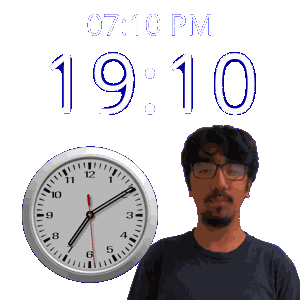 a man wearing glasses stands in front of a clock that says 19:10