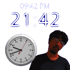 a man is standing next to a clock that says 9:42 pm