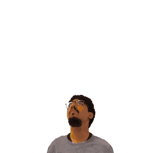a man with glasses looks up at a green cross on his head