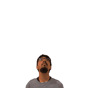 a man with glasses looks up at a green cross on his head