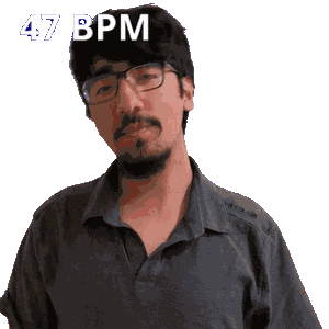 a man wearing glasses and a shirt that says 47 bpm on the bottom