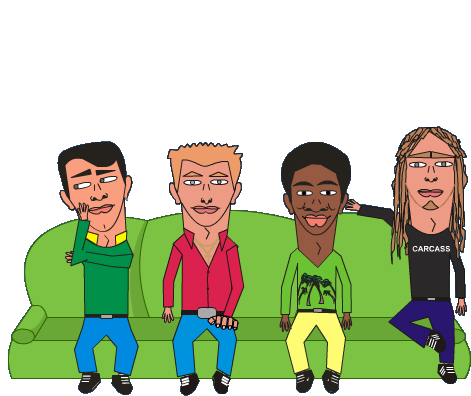 a group of men are sitting on a green couch and one of them is wearing a black shirt that says carcass