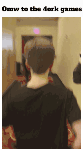A person runs down a hotel hallway, excited and on their way to the 4ork games, as indicated by the caption.
