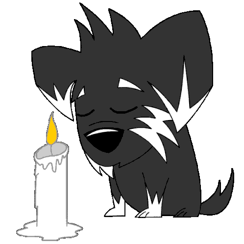 A sad cartoon Trini Pothound named Brunty sits contemplatively beside a lit candle, evoking feelings of remembrance or loss.