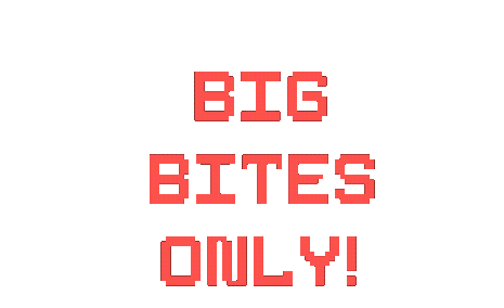 A pixelated Pac-Man-like character eats the words 'Big Bites Only!' in a retro arcade style animation.