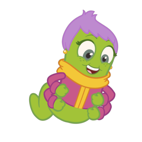 a green cartoon character with purple hair and a scarf around her neck