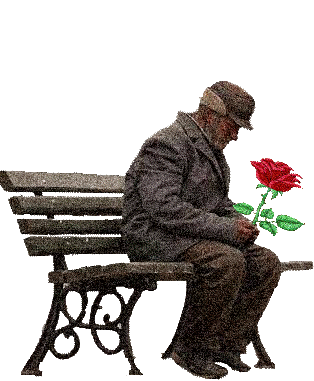 An old man sits alone on a bench, holding a single red rose, conveying a feeling of loneliness and sadness.