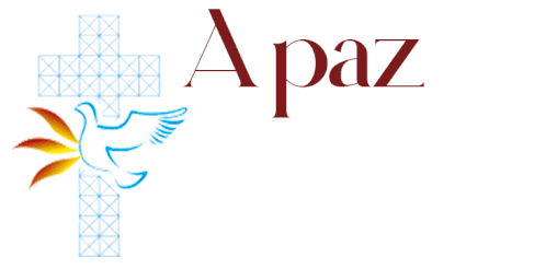 A religious sticker featuring a cross, a dove, and the Portuguese phrase 'A Paz de Deus esteja com você!' with an emoji.