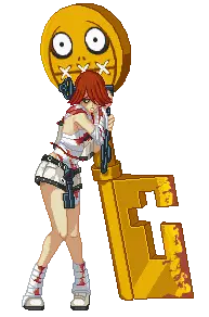 Aba from Guilty Gear Strive hangs upside down, holding onto her large, yellow Morgenstern weapon with a stitched mouth.