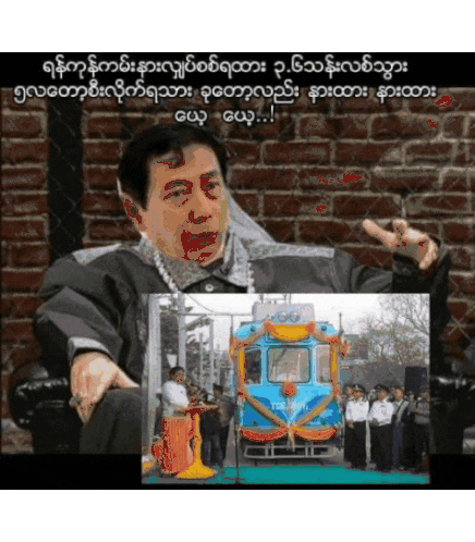 A satirical sticker featuring a caricature of U Htay Oo, criticizing the USDP's unfulfilled railway projects in Myanmar, highlighting abandoned tracks and bridges.