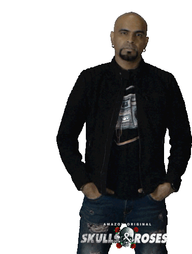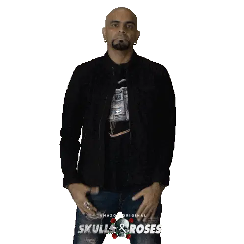 a man in a black jacket is standing in front of a poster that says abe ch *** ye