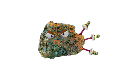 A rock-like creature with eyes and screw appendages splits apart, revealing a reddish interior.
